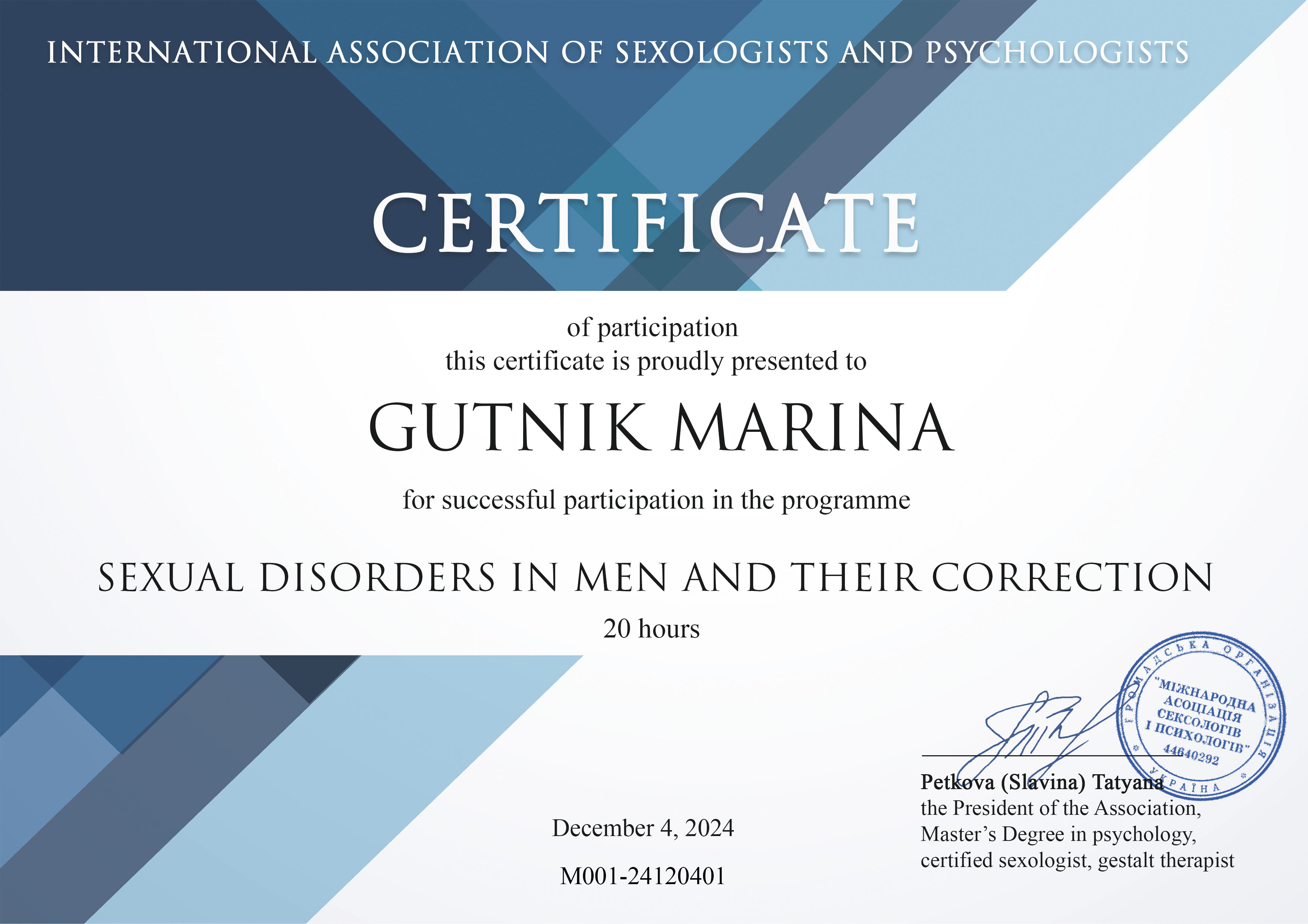 Крім того, я маю професійну підготовку в галузі інтимного коучингу для чоловіків. Я супроводжую чоловіків у зміцненні впевненості, розумінні власних потреб, покращенні емоційної та тілесної чутливості, а також у формуванні зрілої та збалансованої сексуальності.